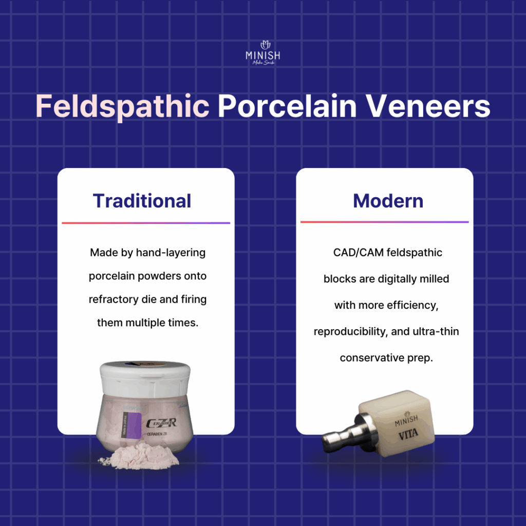 Clinically, feldspathic veneers exist in two distinct forms. Traditionally, technicians fabricated them by hand-layering porcelain powders onto a refractory die and firing the restoration multiple times. This classic approach produces beautiful, highly individualized gradation but often requires greater tooth reduction and exceptional technical skill. By contrast, modern CAD/CAM feldspathic blocks provide the same esthetic qualities with more efficiency, reproducibility, and ultra-thin conservative preps. When further hand-finished, as with MINISH BLOCS, they combine the efficiency of digital milling with the finesse of traditional artistry.